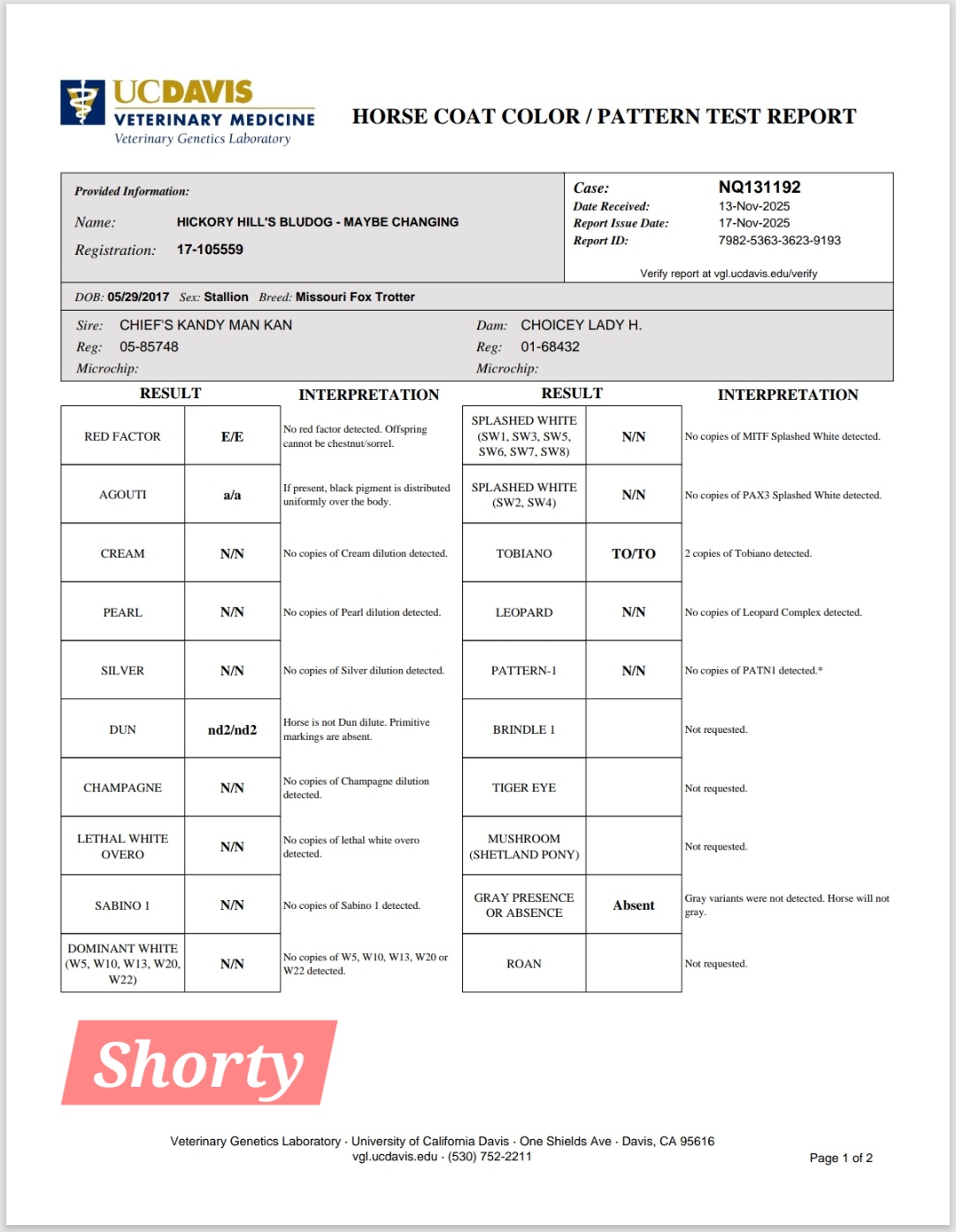 Extremely sweet stallion that produces the desired qualities (gait, shake, stride, and disposition) with the added “Hollywood” color……Chrome!